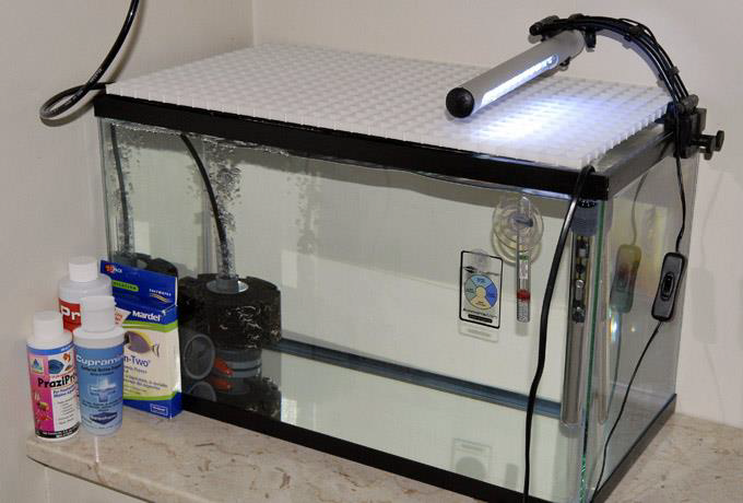 4 – نظام ترشيح Filtration: أنظمة الحجر لا تتطلب أنظمة ترشيح معقدة. في الواقع، أنت لا تريد تشغيل نظام ترشيح معقد فقد يتعارض ذلك مع خطوات العلاج المحتملة. فكل ما تحتاجه مرشح اسفنجي Sponge Filter ومضخة هواء رخيصة. أذا كان لديك مرشح أسطواني Canister Filter أو On Power-Hang فلتر لا تتردد باستخدامه بدون الكربون النشط Active Carbon.